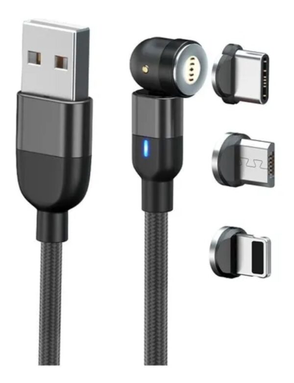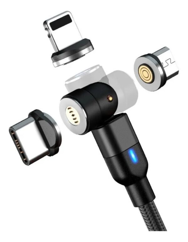 Cable de carga rápida y transferencia de datos rotativo. Con conector magnético Tipo C, Micro USB o iPhone que permite cargar fácilmente cualquier equipo.
